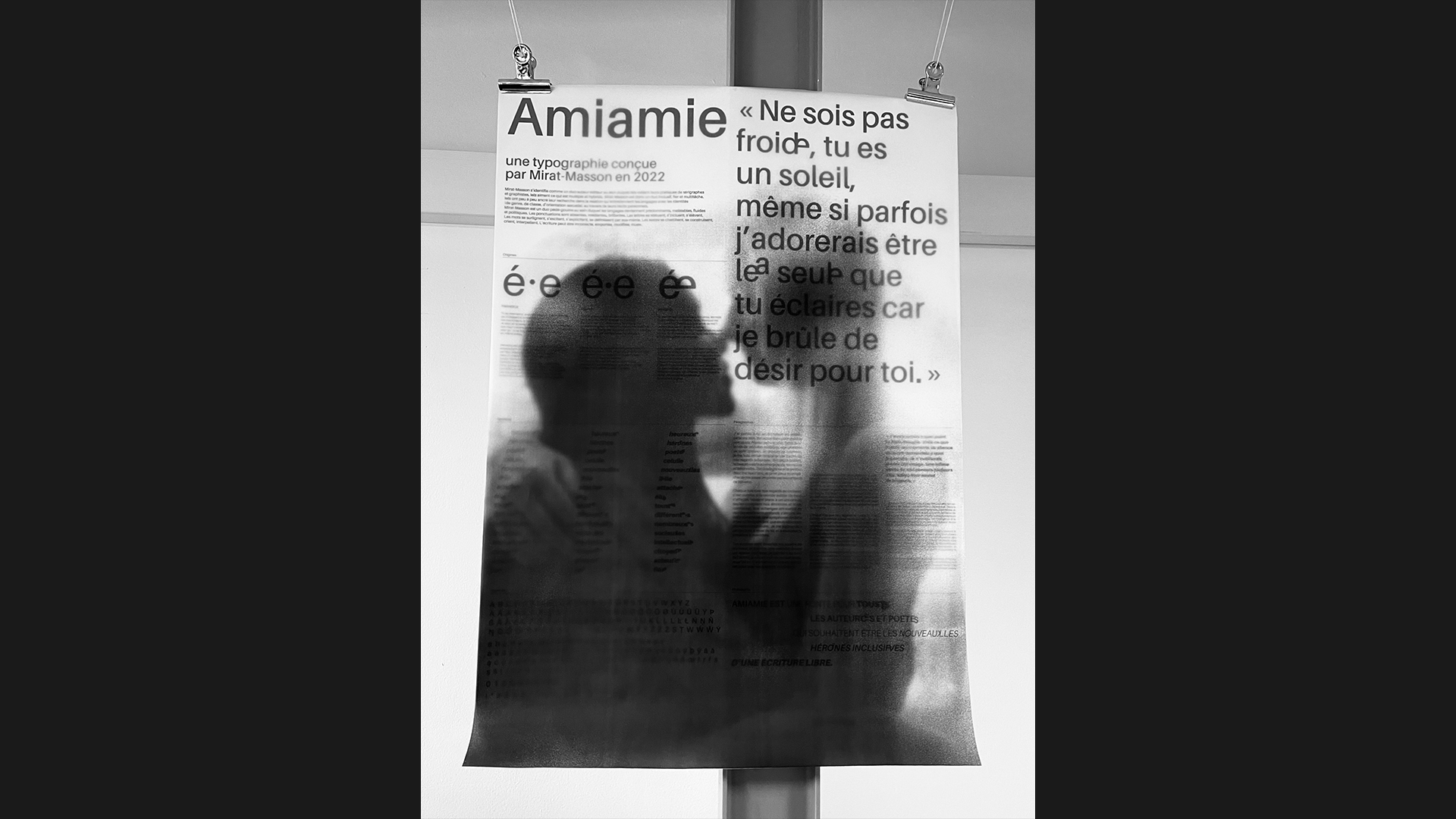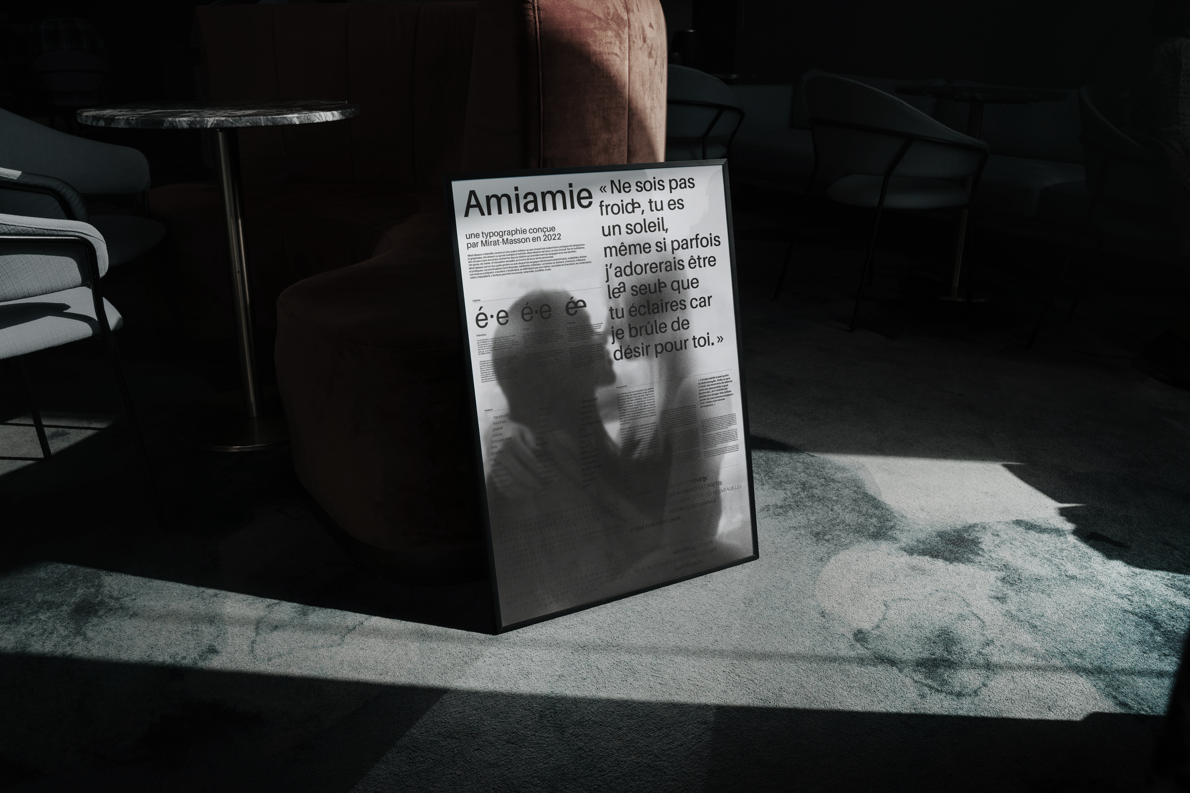 We wanted to create a typographic specimen that explores duality: the coldness of a modernist, standardized linear, the ancestor of Amiamie, and the desire to write "love letters" with it. Bringing softness, radiance, warmth and connection through ligatures that bring us together and erase discrimination. We also explored the idea of the evolution of the "love letters", from the handwritten letter of yesterday to today's 140 characters.