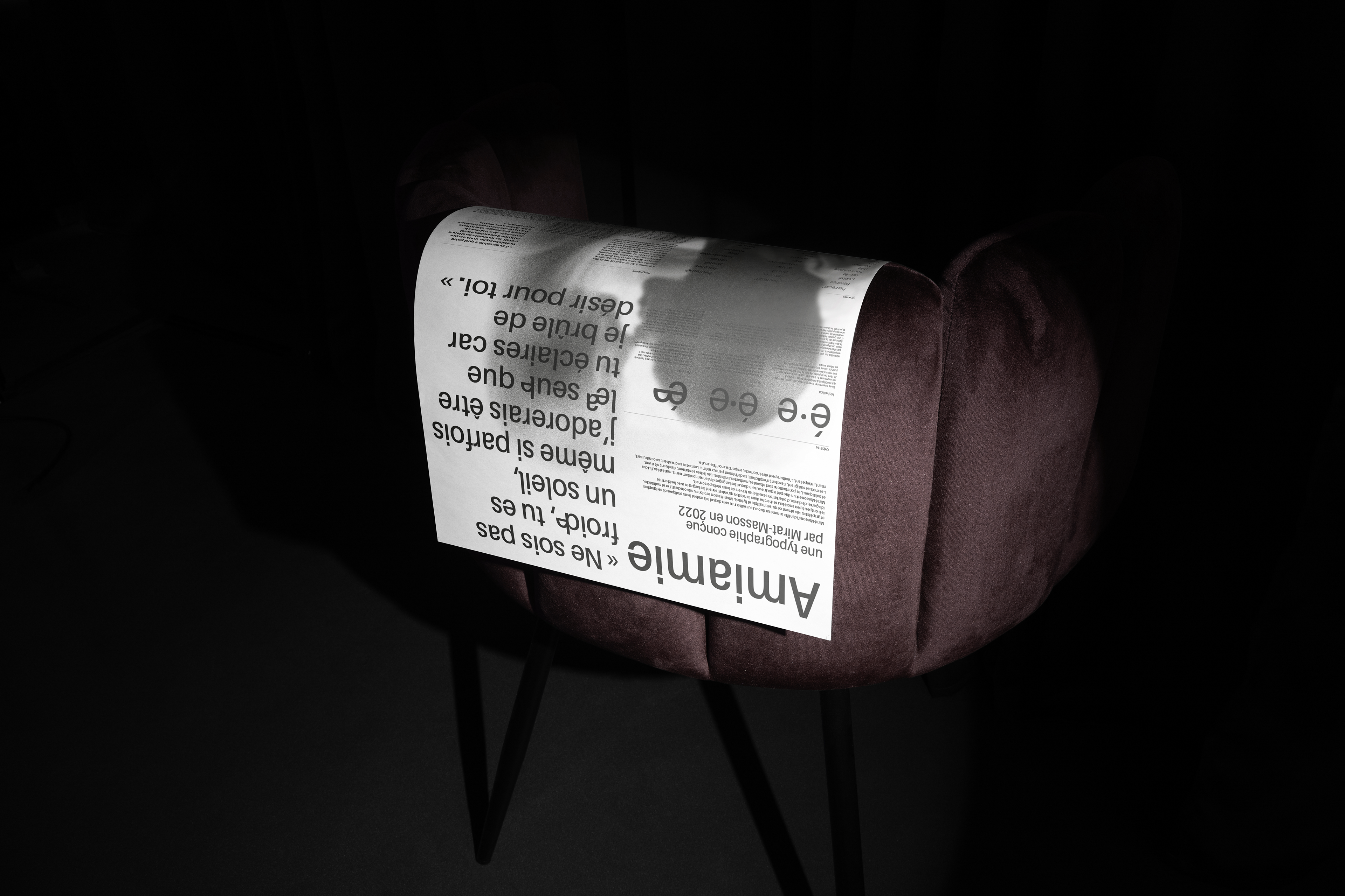 The photo on the layer creates a sense of cover/discovery, of seeing through to the intimacy of this loving couple. We used texts from the Instagram account @amours_solitaires as well as original creations to put our typeface in situation of love letters.