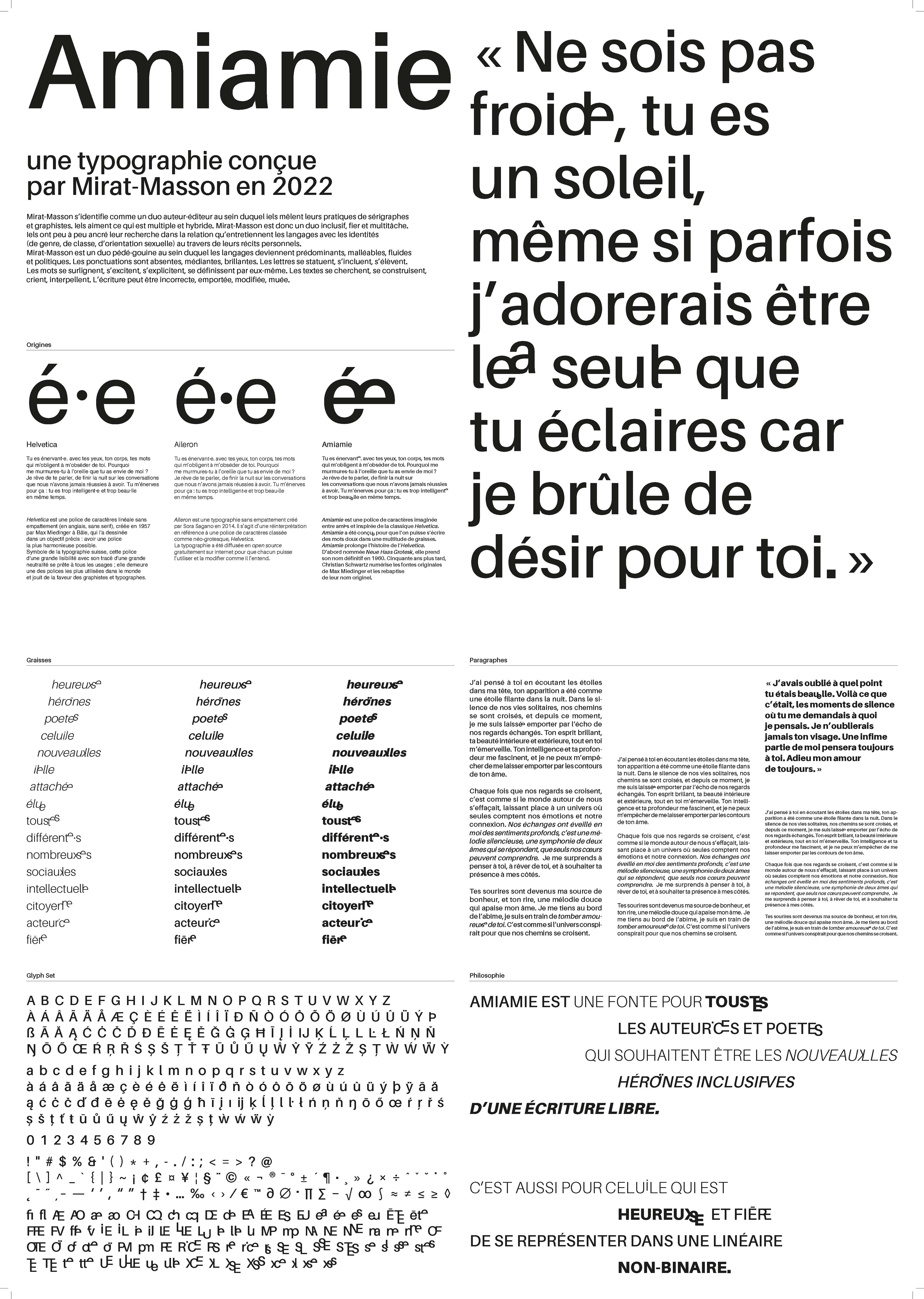 Amiamie est une typographie conçue par Mirat-Masson. C'est une police de caractères imaginée entre ami·es et inspirée de la classique Helvetica. Elle a été conçue pour que l’on puisse s’écrire des mots doux dans une multitude de graisses.